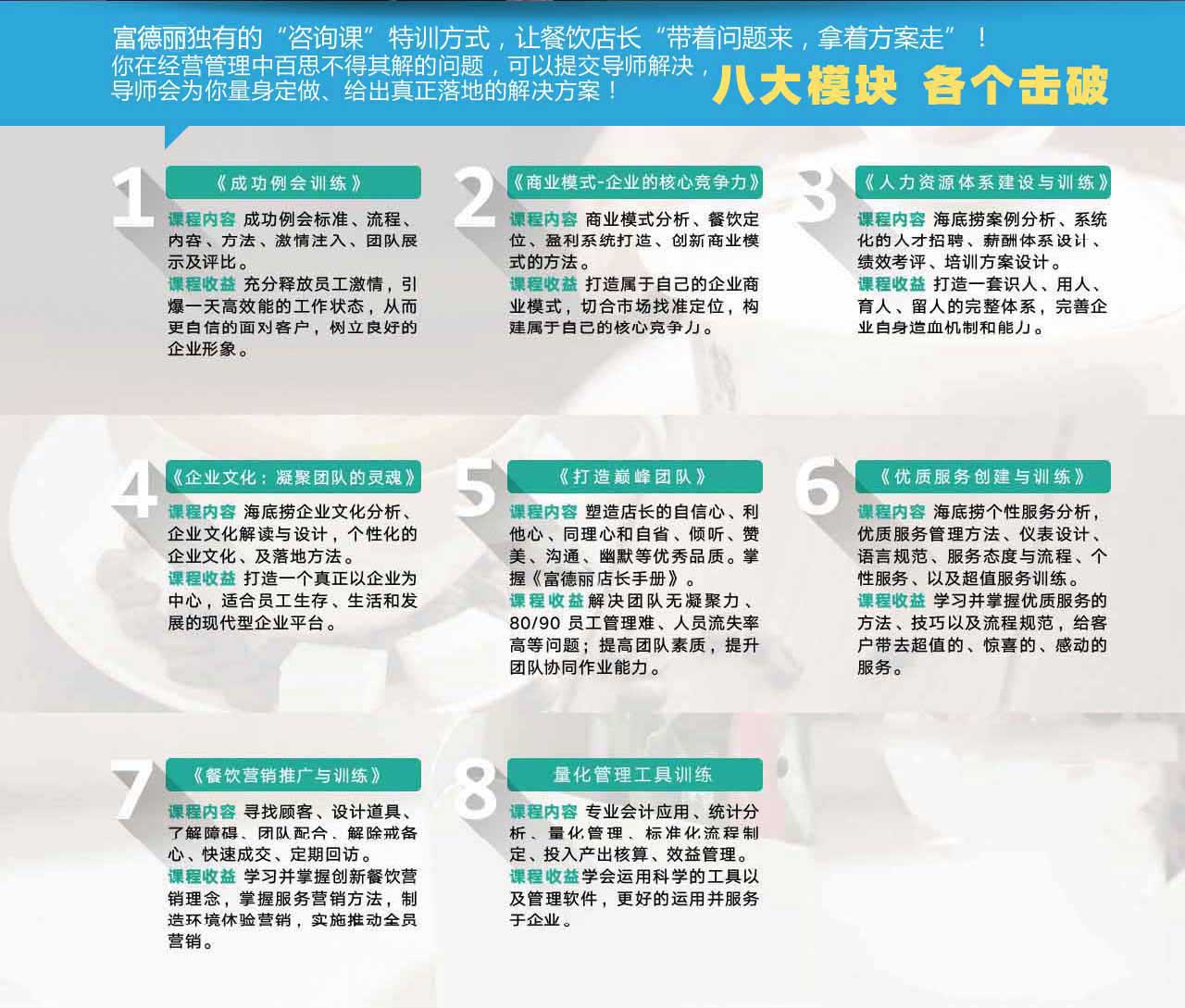 课程设置:引位与点菜、上菜、分菜、换盘与撤盘、餐巾折花、餐厅领台服务程序、中餐点菜铺台操作程序、餐厅斟酒服务程序、餐厅换烟缸操作程序、餐厅结帐服务程序、中餐点菜服务程序、团体包饭服务程序、中餐宴会铺台操作程序、西餐点菜铺台服务程序、西餐点菜服务程序、西餐扒房服务程序、自助餐服务程序、冷餐会服务操作程序、酒会服务操作程序、各种大型会议服务程序、西餐宴会服务操作程序、中餐宴会服务操作程序……餐饮业礼仪培训师培养课程